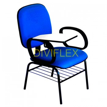 Silla con pupitre rebatible, fija interlocutora, Modelo director, Linea Diviflex tapizado en tela u cuerina, sin costura, espuma laminada Dens 28, con apoya brazo inyectado en poliuretano de color negro, base “4” confeccionado en caño de 7/8 x 1,20 pintado con pintura epoxi con rejilla porta cuadernos.