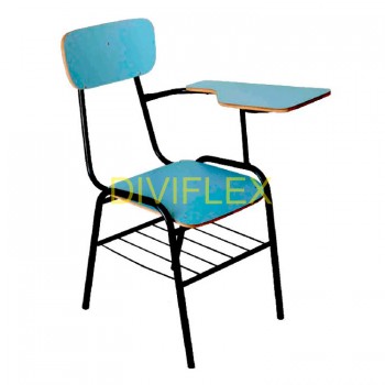 Silla con pupitre fija “4” patas, modelo PF-01, asiento, respaldo y pupitre en madera terciada formicada en color a definir, estructura en caño de 7/8 0,90 pintado con pintura epoxi con rejilla porta cuadernos, pupitre fijo.