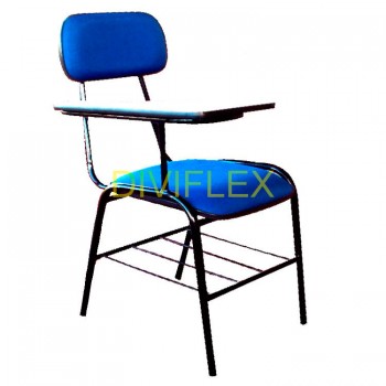 Silla con pupitre fija “4” patas, modelo PF-01, asiento y respaldo tapizado en tela u cuerina con espuma laminada dens 28, estructura en caño de 7/8 0,90 pintado con pintura epoxi con rejilla porta cuadernos, pupitre fijo.